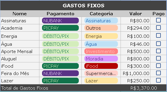 Anote todos os seus custos fixos do mês, como aluguel, água, luz e etc. Controle todas as suas despesas, e saiba o momento certo de economizar!